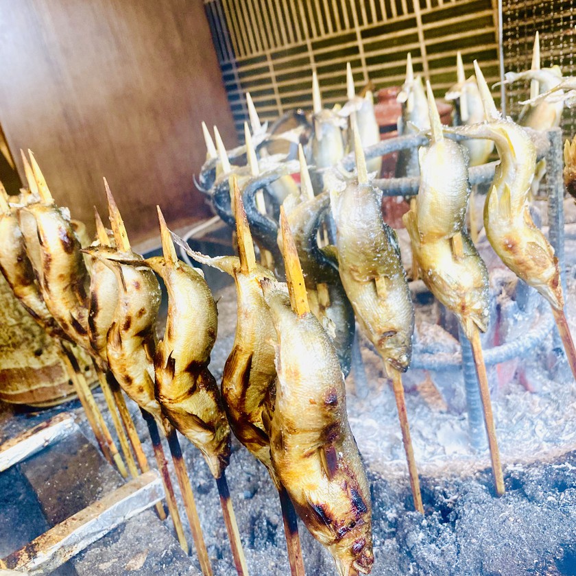 大きな炭火台で焼かれた鮎はまるっと1匹食べることが出来ます✨