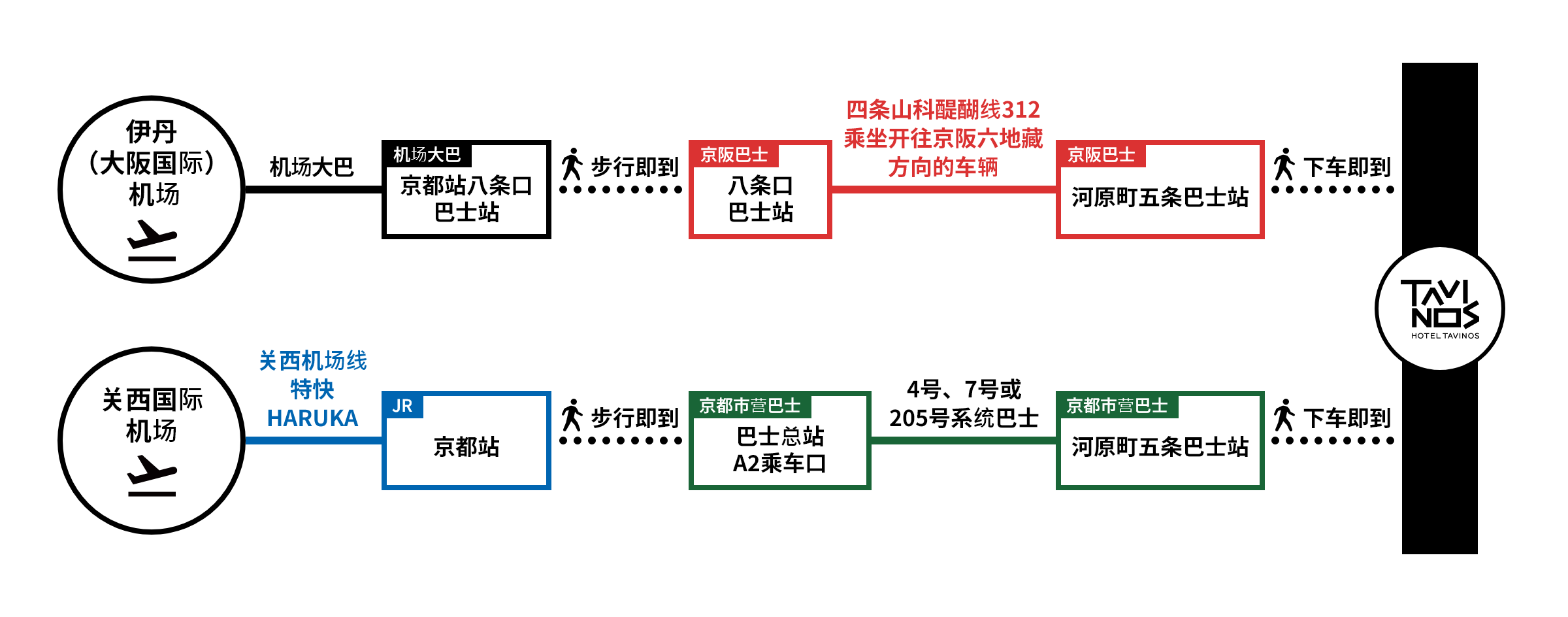 乘坐机场大巴,在京都站八条口下车(约55分钟),然后在京阪巴士八条口巴士乘车口换乘。四条山科醍醐线312 乘坐开往京阪六地藏方向的车辆(约13分钟),在河原町五条巴士站下车即到。