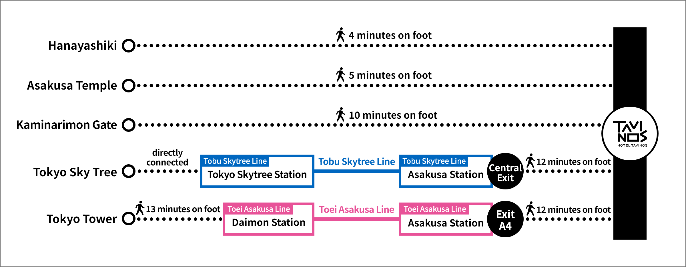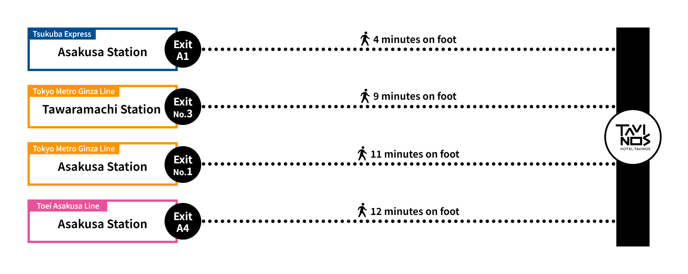 - 4 minutes on foot from Asakusa Station (TX03; Tsukuba Express; Exit A1).