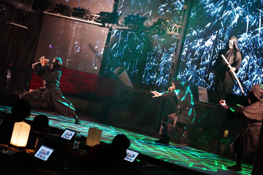The first half of the performance unfolds as an original ninja epic, blending dynamic martial arts with the stylized drama of kabuki theater.