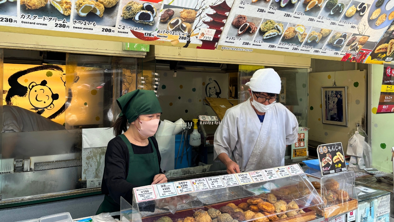 For instance, just before the Hozomon Gate, the third-to-last shop in Nakamise is Asakusa Kokonoe. Established about 30 years ago, Kokonoe sells delectable agemanju deep-fried buns stuffed with anko azuki red-bean paste. Surrounded by a crispy batter, they come in 13 varieties including sesame, matcha, curry, and pumpkin. “We’re proud of the fact that we use only very high-quality oil, so our buns don’t have an oily smell after frying,” says Kokonoe’s owner. “Our biggest seller is the standard-variety agemanju.”