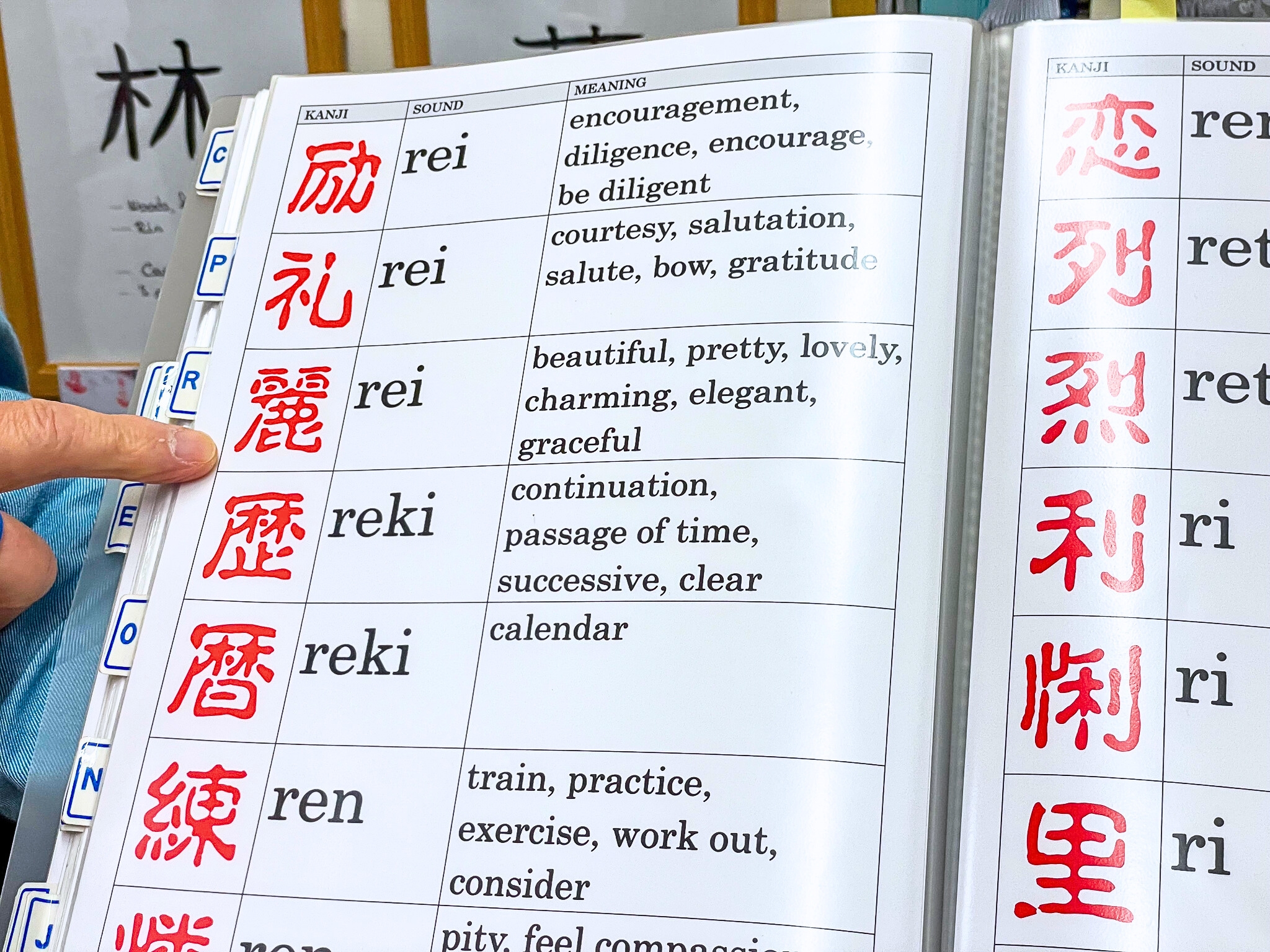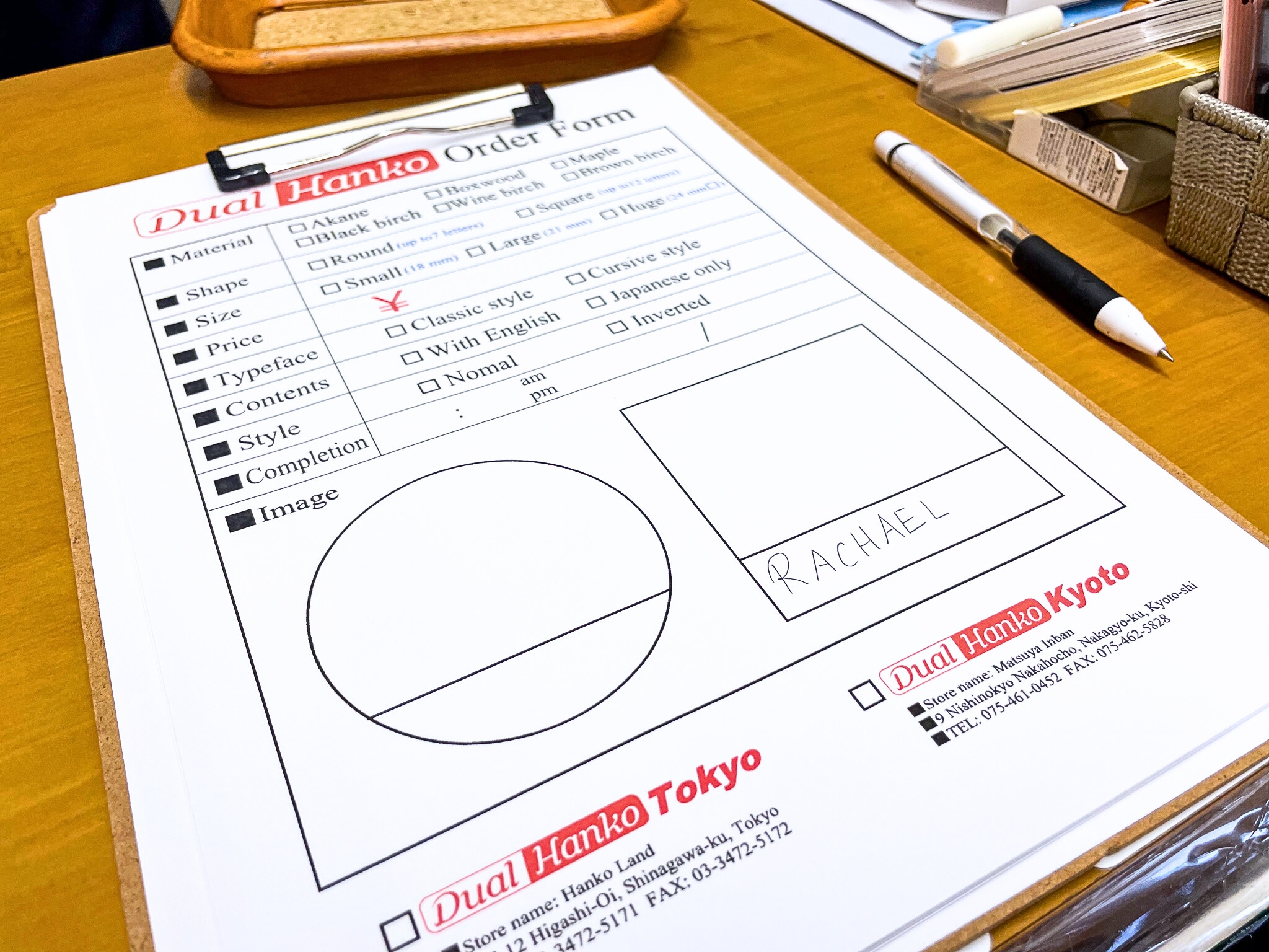 Next, you’ll get to choose which kanji character you’d like to use for your name. Mr. Matsuzaki offers a helpful look-book filled with different kanji, along with their readings and meanings. Since several kanji can share the same pronunciation, you can pick the ones whose meanings resonate with you most. While there may not always be an exact kanji match for every sound in a name, it’s usually possible to get very close. If customers want their name to appear in both kanji and the alphabet, they are simply asked to write their name in capital letters at the bottom of their chosen hanko style.