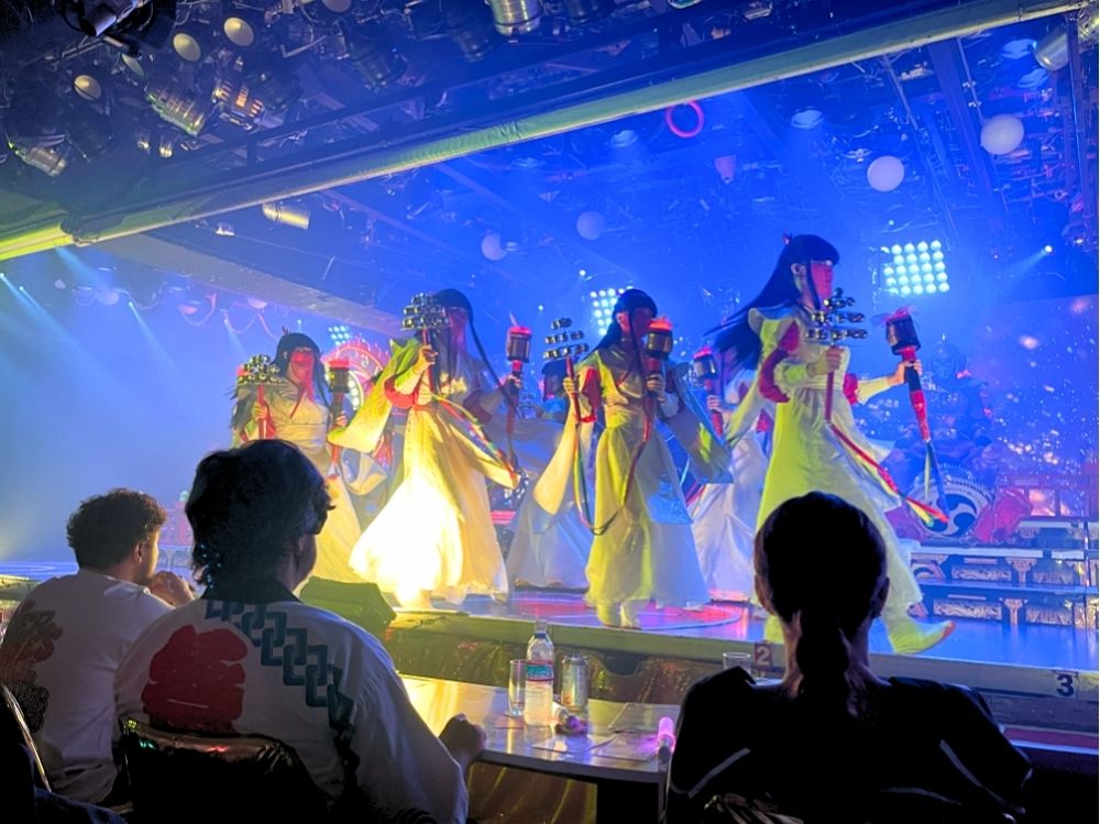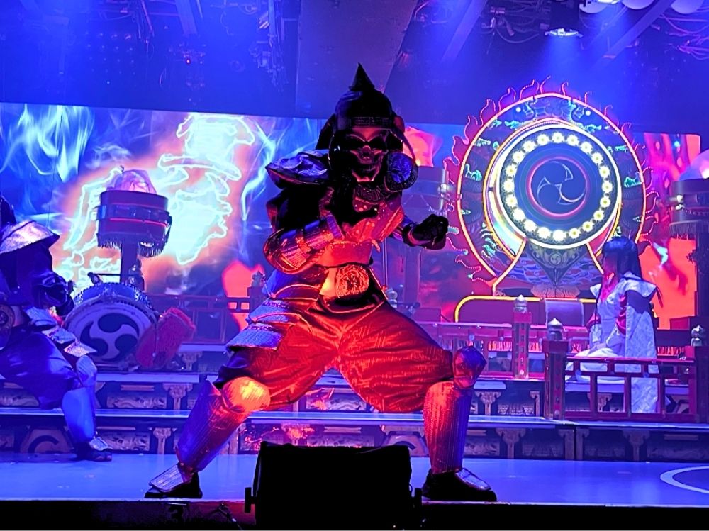 Inside, the space is equal parts nightclub, theater, and theme park, decked out with lights and samurai-inspired motifs. Guests are provided with colorful penlights, encouraging interaction with the performance and contributing to a festive glow throughout the theater. The penlights are collected afterward, but those who want a keepsake can browse the on-site merchandise and souvenir stands during breaks and after the show.