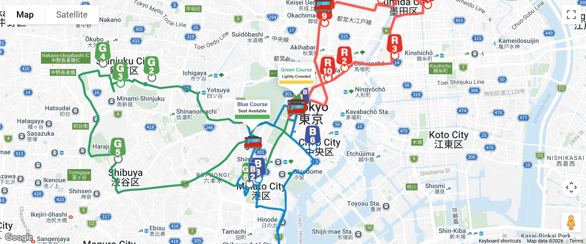The Green Course zeroes in on Tokyo’s busiest modern districts—Shinjuku and Shibuya. Stops include Shinjuku Station, Shibuya City Hall, and Tokyo Tower, before looping back to the business district of Marunouchi.