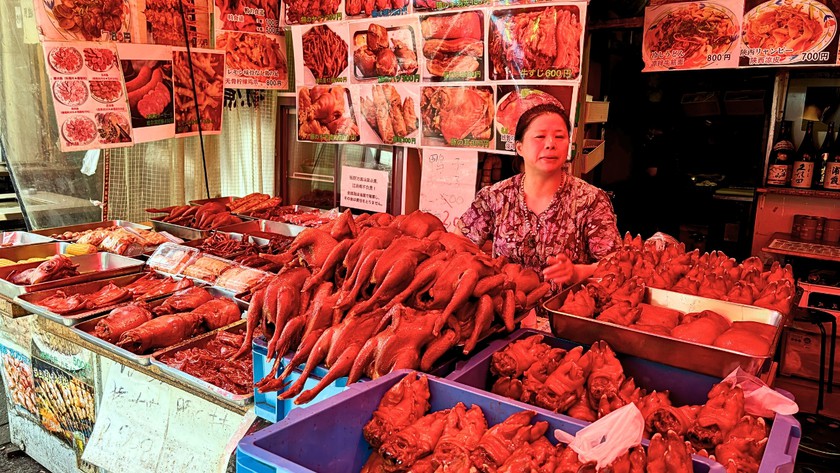 There’s also a surprisingly international variety of treats among the shops on Ameyoko-dori Street. You can find Turkish kebabs, Chinese dumplings and Japanese takoyaki fried octopus, along with stalls selling cut fruit, onigiri rice balls and whole chicken. In the basement of the nearby Ameyoko Center Building, there’s an Asian market selling products that are rare in Japan: pig heads and pig snouts, chicken feet, cow lungs and turtles. On top of that, the market has many other Asian foodstuffs including seasonings, sauces and spices. It’s all part of the authenticity of Tokyo’s colorful yokocho alleys.