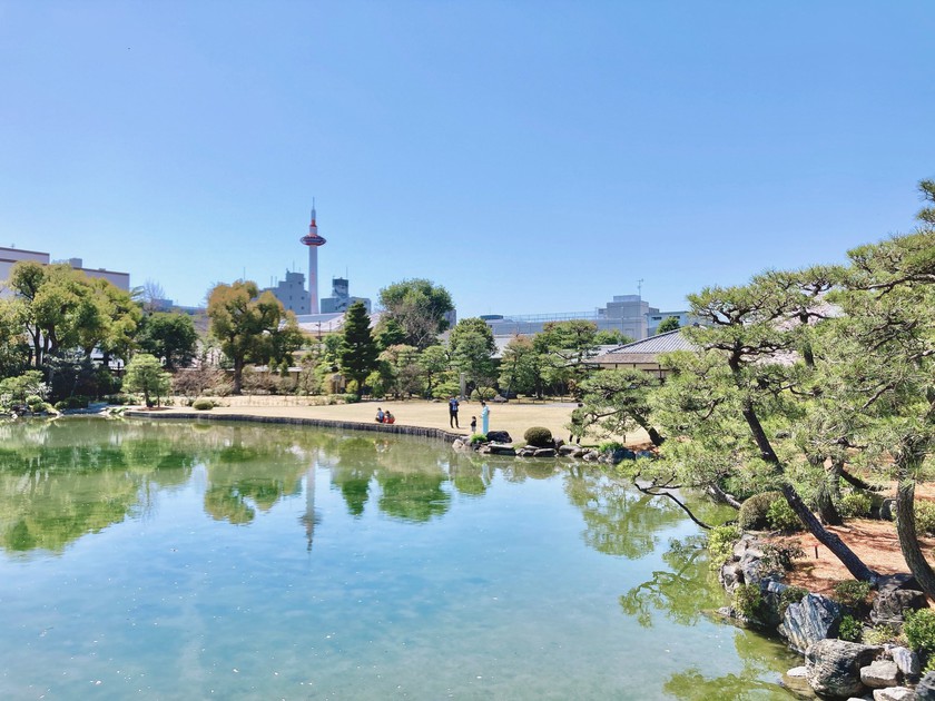 The garden is renowned for its beautiful cherry blossoms in the spring and vibrant colors in the autumn. From there you can also see Kyoto Tower in the distance.