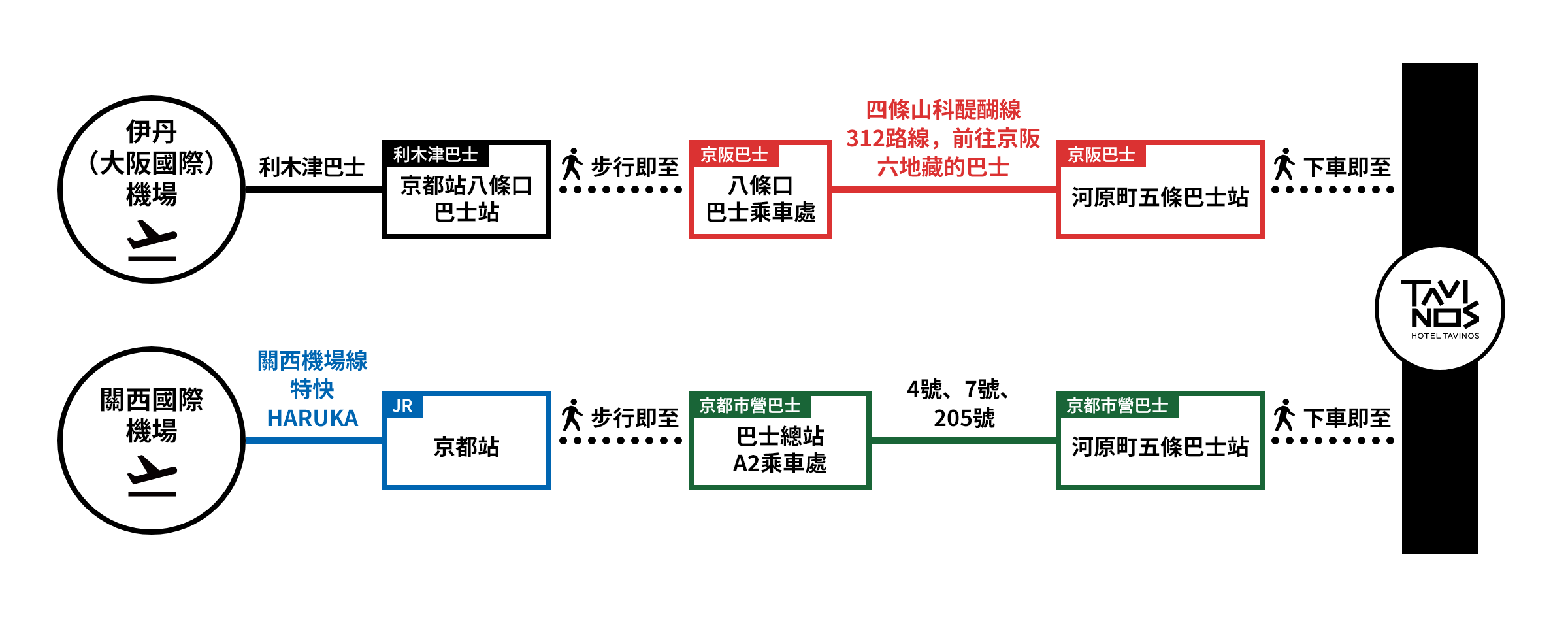 搭乘關西機場線特快HARUKA,在京都站下車(約90分鐘),在京都市營巴士巴士總站A2乘車處轉乘。 搭乘4號、7號、205號(約13分鐘),在河原町五條巴士站下車即至。